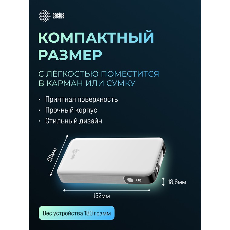 Габариты корпуса гаджета позволяют легко разместить его в кармане сумки или рюкзака. Стоит отметить и приятный для глаз внешний вид гаджета, благодаря чему внешний аккумулятор CS-PBFSPA-10000 выглядит как стильный аксессуар.