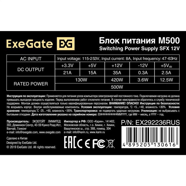 ExeGate EX292236RUS – качественная и надежная модель источника электропитания, предназначенного для снабжения электрической энергией всех узлов компьютера.