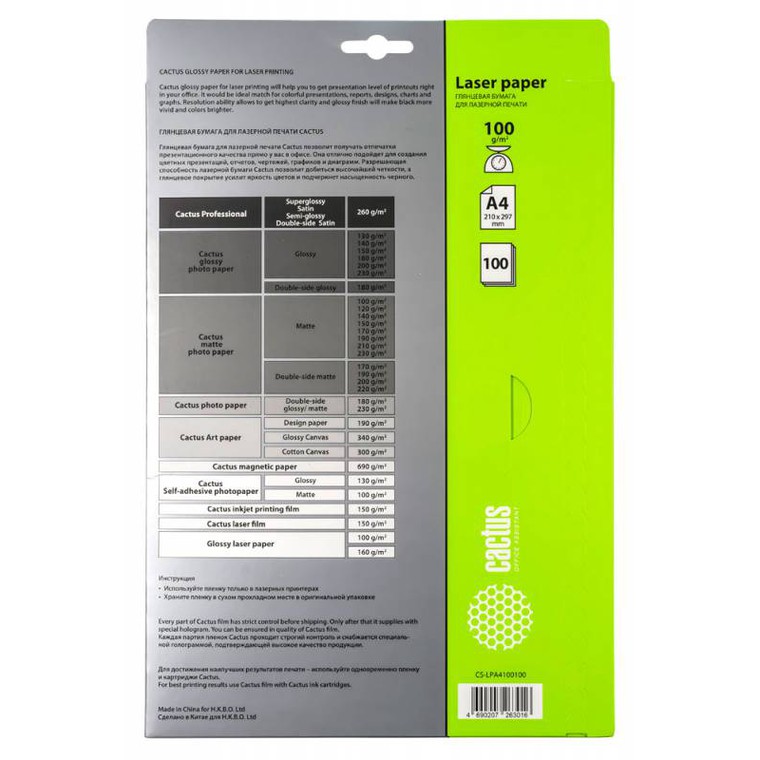 Бумага обладает высокой плотностью, составляющей 100 мкм. Стоит отметить, что офисная бумага Cactus изготовлена одним из лидеров в области производства бумаги для офиса, компанией Cactus. Состав бумаги обеспечивает отличную цветопередачу, устойчивость нанесённой информации к солнечному свету, что обеспечивает в свою очередь долговечность распечатанных документов.