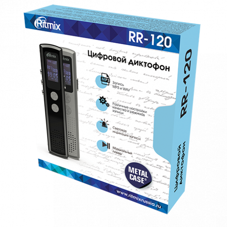 Цифровой Ritmix RR-120 может похвастаться миниатюрными размерами, элегантным дизайном и широкими функциональными возможностями. Корпус девайса обладает высокой прочностью и окрашен в черный цвет. Наличие в конструкции Ritmix RR-120 чувствительного микрофона позволяет с его помощью записывать звуковые файлы в высоком качестве.