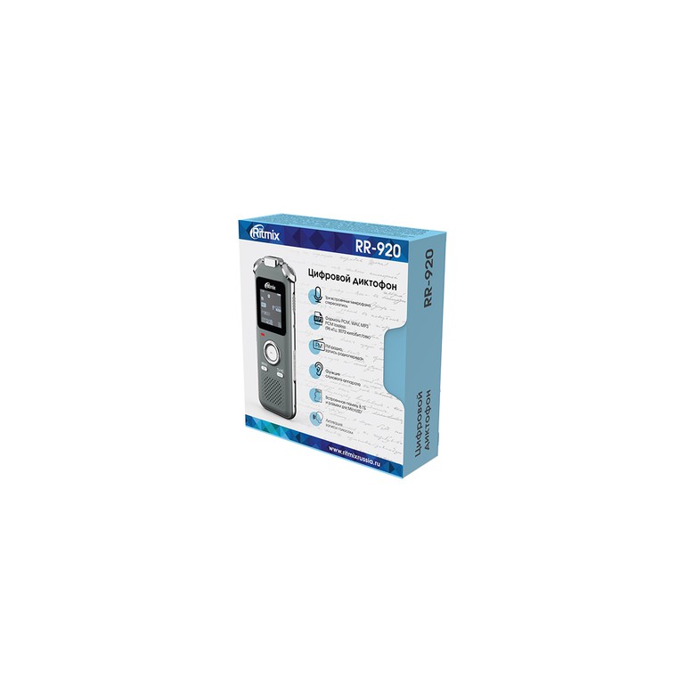 Цифровой Ritmix RR-920 может похвастаться миниатюрными размерами, элегантным дизайном и широкими функциональными возможностями. Корпус девайса обладает высокой прочностью и окрашен в серый цвет. Наличие в конструкции Ritmix RR-920 чувствительного микрофона позволяет с его помощью записывать звуковые файлы в высоком качестве.