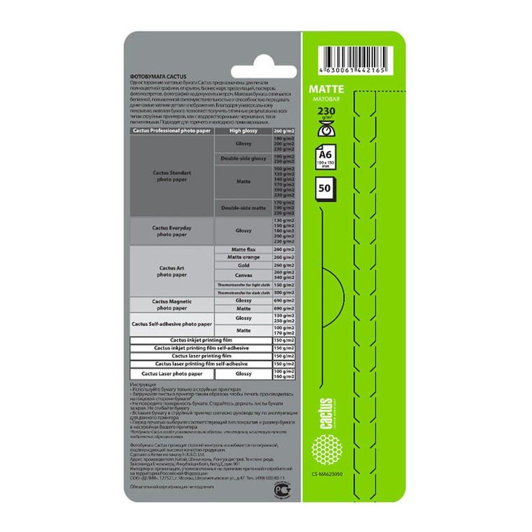 При необходимости бумага хорошо режется до необходимого пользователю формата. Плотность фотобумаги Cactus представленной вашему вниманию составляет 230 мкм. Наличие специального покрытия на поверхности бумаги обеспечивает качество печати сопоставимое с качеством традиционной фотографии.