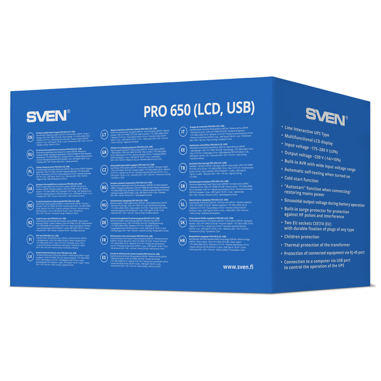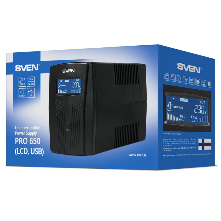 ИБП Sven Pro 650 (LCD, USB) предназначен для защиты компьютерной и электронной техники от неполадок возникающих в электрической сети, таких как понижение, повышение или отключение электроэнергии, высоковольтные выбросы, электромагнитные или радиочастотные помехи.