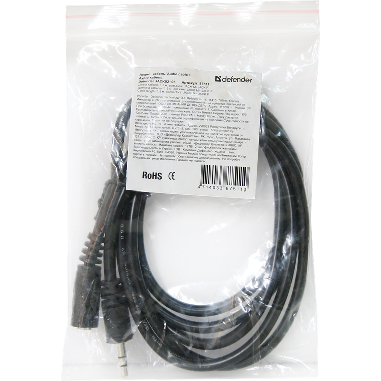 Наличие на кабеле Defender прочной оплётки надёжно защищает его от повреждений, воздействия влаги и пыли. Модель поставляется в упаковке типа OEM. Концы кабеля оснащены разъёмами 3.5 Jack (m) и 3.5 Jack (f), что делает его совместимым с большинством моделей оборудования.