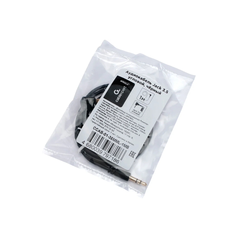 Кабель аудио (угловой) Cablexpert CCAB-01-35MML-1MB, Jack 3.5(M)/Jack 3.5(M), Mobile, черный, 1м, пакет
