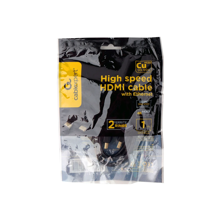 От механических повреждений и воздействия влаги кабель защищён прочной оплёткой. Длина кабеля составляет 1 метра. Поставляется в упаковке типа - пакет. Для коммутации с электронными приборами концы кабеля оснащены разъёмами HDMI (m) и HDMI (m).