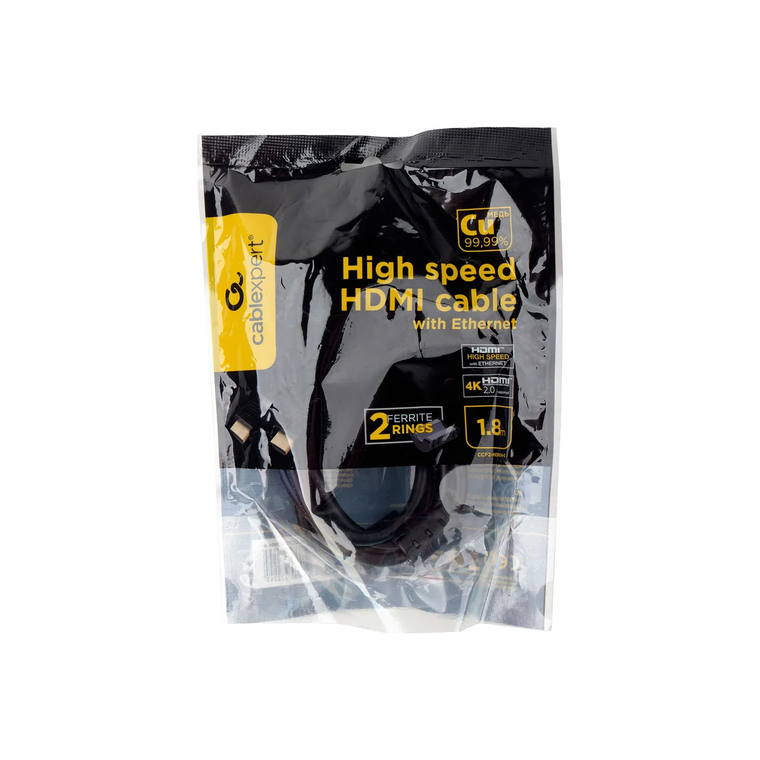 От механических повреждений и воздействия влаги кабель защищён прочной оплёткой. Длина кабеля составляет 1.8 метра. Поставляется в упаковке типа - пакет. Для коммутации с электронными приборами концы кабеля оснащены разъёмами HDMI (m) и HDMI (m).