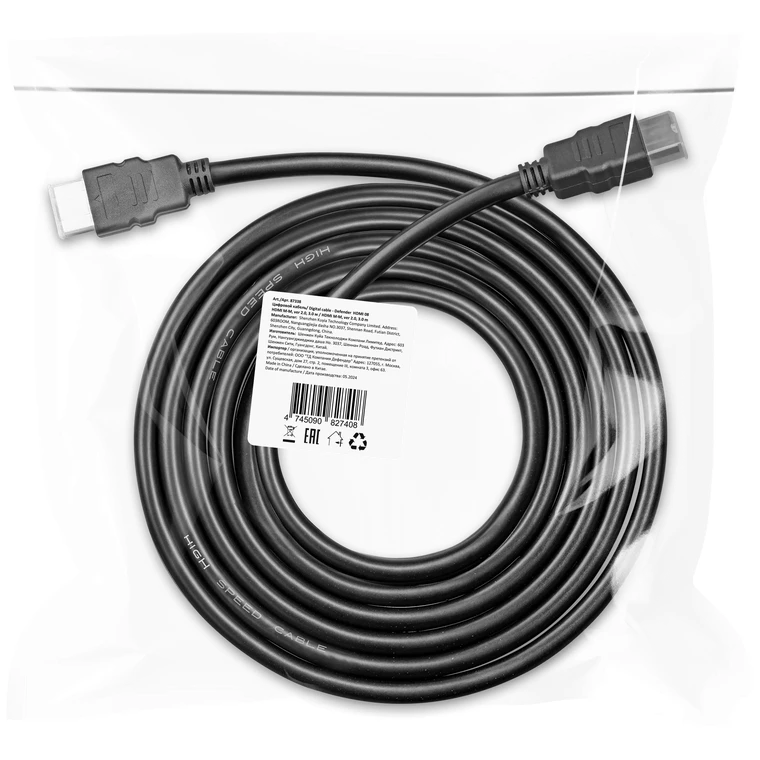 От механических повреждений и воздействия влаги кабель защищён прочной оплёткой. Длина кабеля составляет 3 метра. Поставляется в упаковке типа - пакет. Для коммутации с электронными приборами концы кабеля оснащены разъёмами HDMI (m) и HDMI (m).