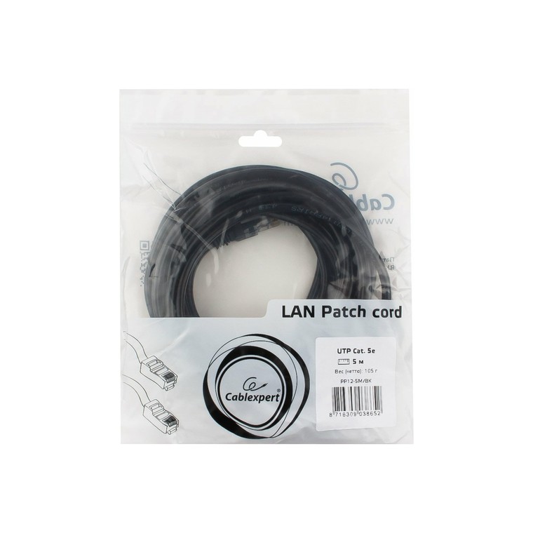 Кабель сетевой UTP Cablexpert PP12-5M/BK, черный. Длина кабеля - 5 м. Модель полностью безопасна в использовании.
