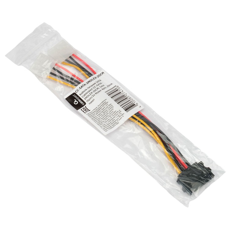 Кабель питания Cablexpert (CC-SATA-2MOLEX-20CM), 0.2 м., SATA 15 pin/SATA 15 pin, триколор. Модель полностью безопасна в использовании.