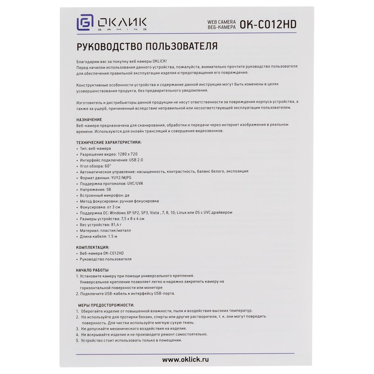 Веб-камера Oklick OK-C012HD это простая по конструкции и удобная в использовании камера с помощью которой вы легко сможете организовать видеосвязь с друзьями или же провести видеоконференцию. Разрешение камеры составляет 1280x720, что позволяет ей передавать картинку в высоком качестве.