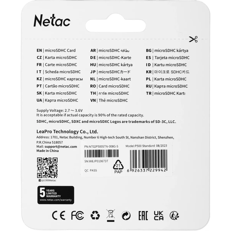 Карта памяти microSDHC (класс 10) 8 GB Netac P500 (80MB/s) (NT02P500STN-008G-S). Эта карта расширяет способность памяти многофункциональных мобильных телефонов, цифровых камер, карманных компьютеров и других портативных устройств, поддерживающих данный формат, и класс карт.Идеально подходит для записи любых видов данных. Сохраните больше своих собственных коллекций музыки, видеороликов, кинофильмов, рингтонов, картин и фотографий.