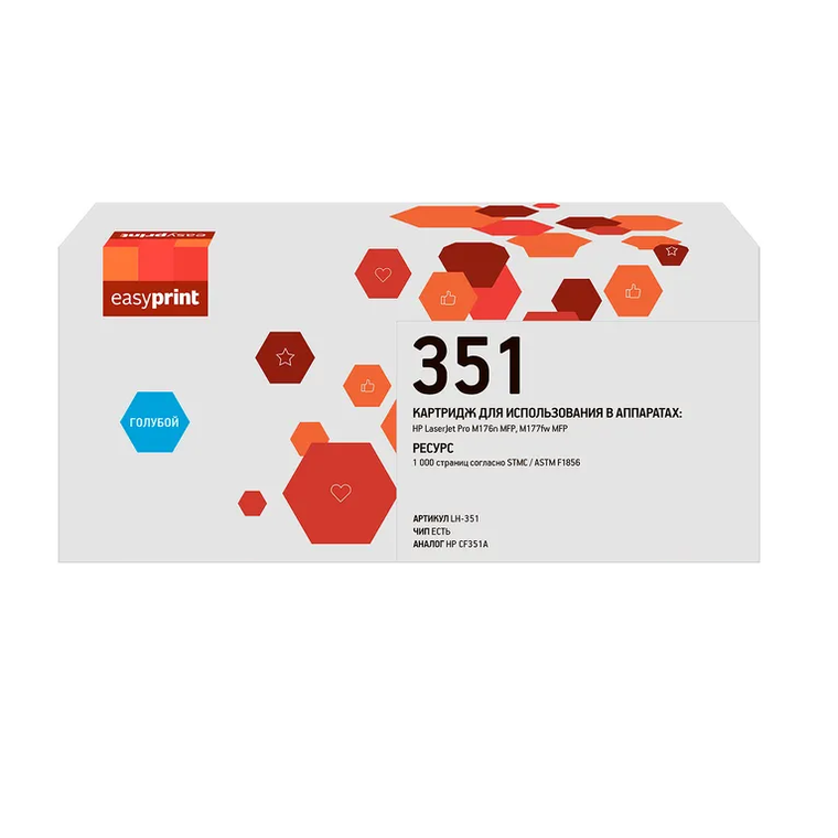 Картридж (CF351A) совместим с такими моделями принтеров, как HP LaserJet Pro M176n MFP/M177fw MFP. Средний ресурс картриджа - 1000 стандартных страниц, однако реальный ресурс может изменяться в зависимости от выводимых на печать документов или изображений.