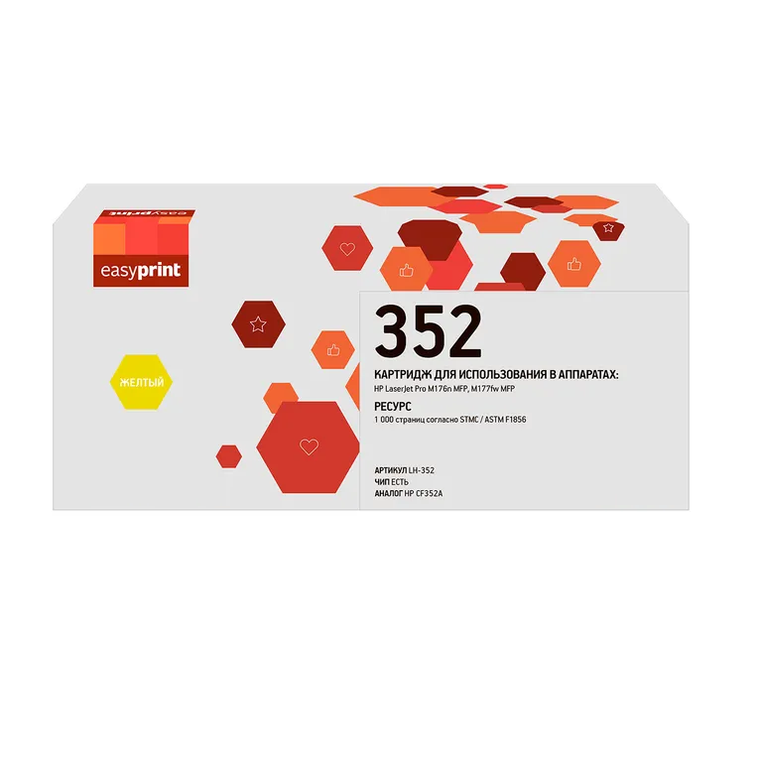 Картридж (CF352A) совместим с такими моделями принтеров, как HP LaserJet Pro M176n MFP/M177fw MFP. Средний ресурс картриджа - 1000 стандартных страниц, однако реальный ресурс может изменяться в зависимости от выводимых на печать документов или изображений.
