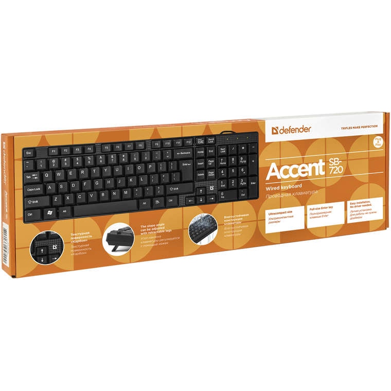 Клавиатура Defender Accent SB-720 это небольшая по размерам, удобная в ежедневном использовании проводная клавиатура, которая поможет вам более уверенно взаимодействовать с ПК и управлять его работой. Для подключения клавиатуры к компьютеру используется интерфейс USB.