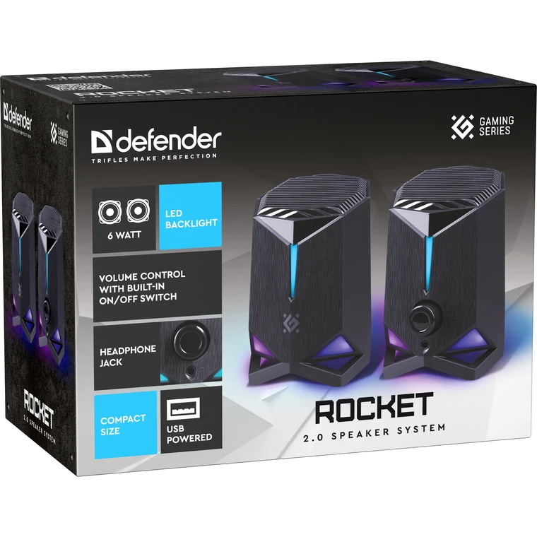 Defender Rocket это мощные, простые в использовании и надёжные 2.0 канальные колонки, которые позволят вам наслаждаться музыкой в непревзойдённом качестве звучания. При высокой мощности, составляющей 6 Ватт, колонки отличаются демократичной стоимостью.