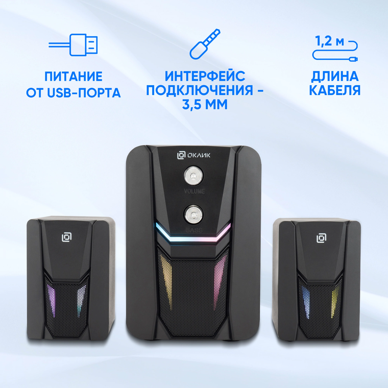 Колонки для компьютера также совместимы с ноутбуком. Для подключения к компьютеру или ноутбуку в конструкции акустической системы Oklick OK-423 предусмотрены Джек 3,5 мм входы. В комплектацию системы входят длинные провода, что позволяет размещать её элементы в удобном для пользователя месте.