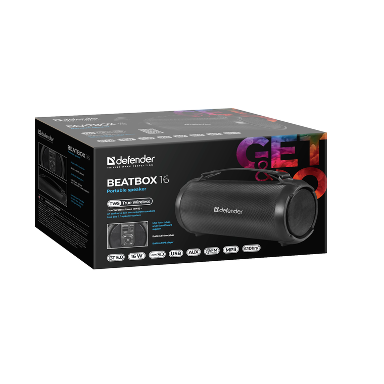 Defender Beatbox 16 это простые и надёжные в использовании портативные колонки от компании Defender. Представленная модель предлагает пользователю небольшие размеры и стильный дизайн, благодаря чему использовать устройство можно в любой обстановке, например, Defender Beatbox 16 можно взять с собой в дорогу.