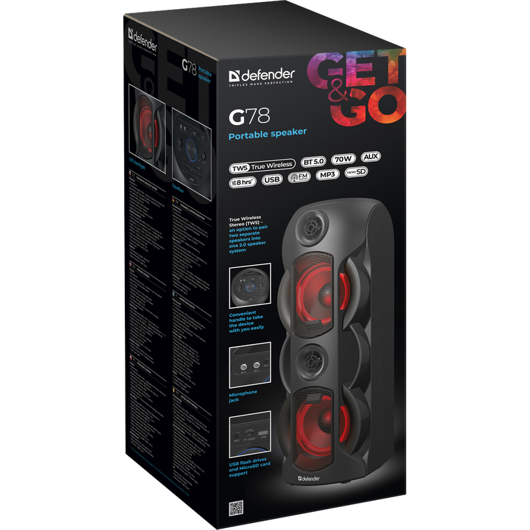 Купить портативную колонку можно всего в пару кликов по доступной цене. Для этого просто достаточно добавить товар в корзину и сделать заказ. Для подключения колонок Defender G78 к компьютеру или ноутбуку в их конструкции представлены AUX/USB /USB Type-C входы. Стоит отметить и небольшую массу устройства, благодаря чему, как это уже указано выше Defender G78 можно с успехом использовать в дороге или путешествиях.