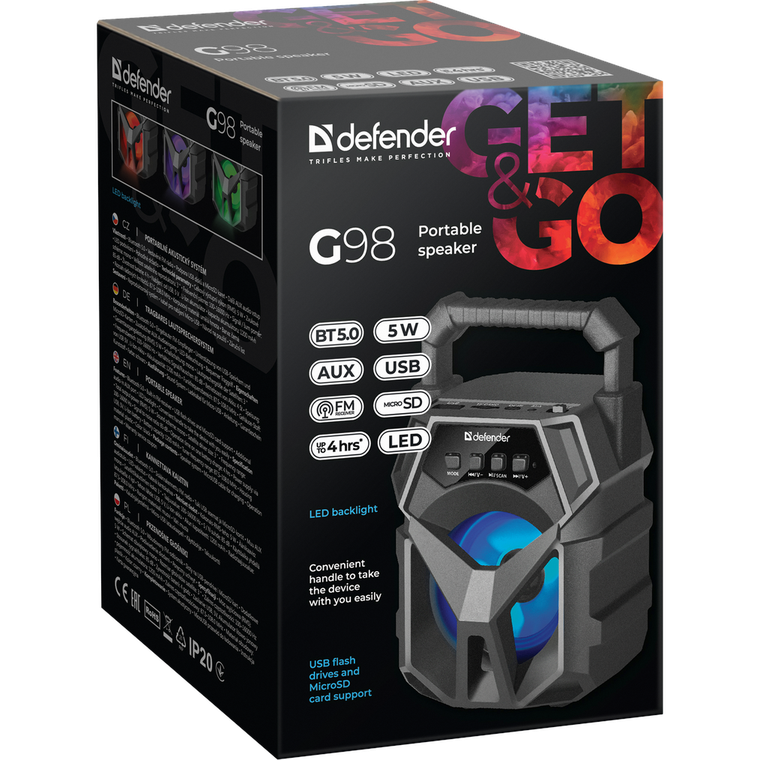 Defender G98 это простые и надёжные в использовании портативные колонки от компании Defender. Представленная модель предлагает пользователю небольшие размеры и стильный дизайн, благодаря чему использовать устройство можно в любой обстановке, например, Defender G98 можно взять с собой в дорогу.