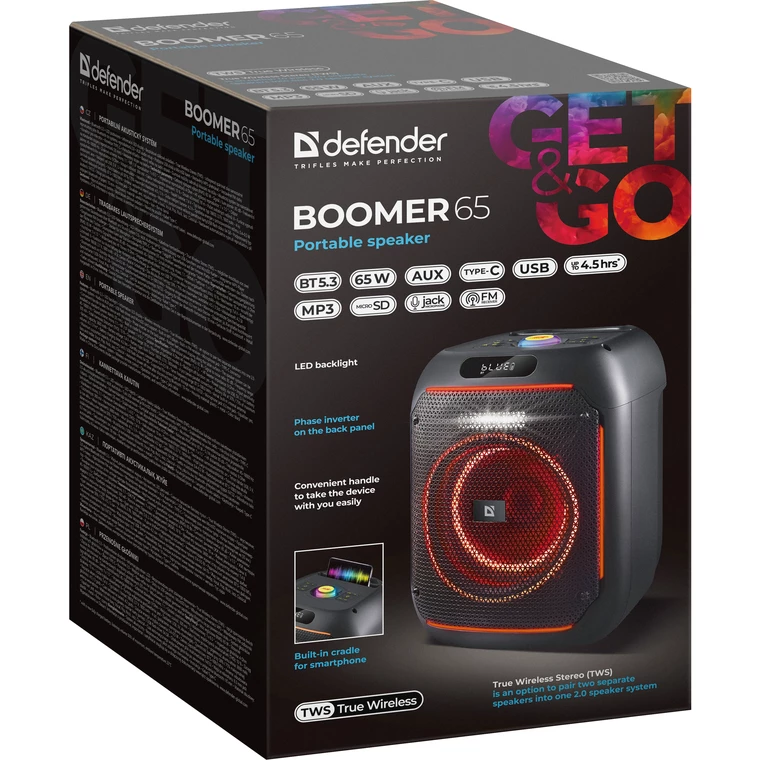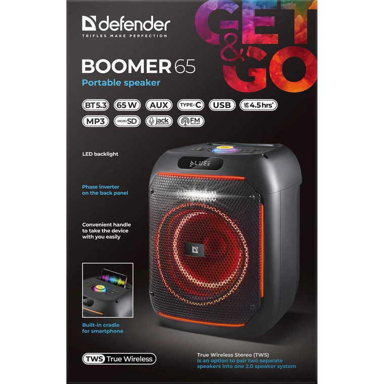 Defender Boomer 65 это простые и надёжные в использовании портативные колонки от компании Defender. Представленная модель предлагает пользователю небольшие размеры и стильный дизайн, благодаря чему использовать устройство можно в любой обстановке, например, Defender Boomer 65 можно взять с собой в дорогу.