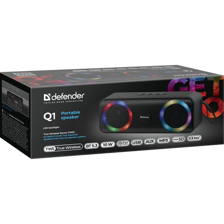 Defender Q1 это простые и надёжные в использовании портативные колонки от компании Defender. Представленная модель предлагает пользователю небольшие размеры и стильный дизайн, благодаря чему использовать устройство можно в любой обстановке, например, Defender Q1 можно взять с собой в дорогу.