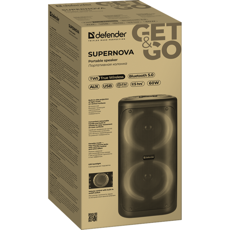 Defender Supernova это простые и надёжные в использовании портативные колонки от компании Defender. Представленная модель предлагает пользователю небольшие размеры и стильный дизайн, благодаря чему использовать устройство можно в любой обстановке, например, Defender Supernova можно взять с собой в дорогу.