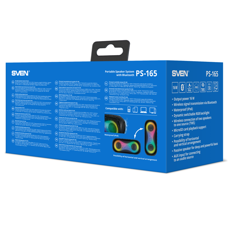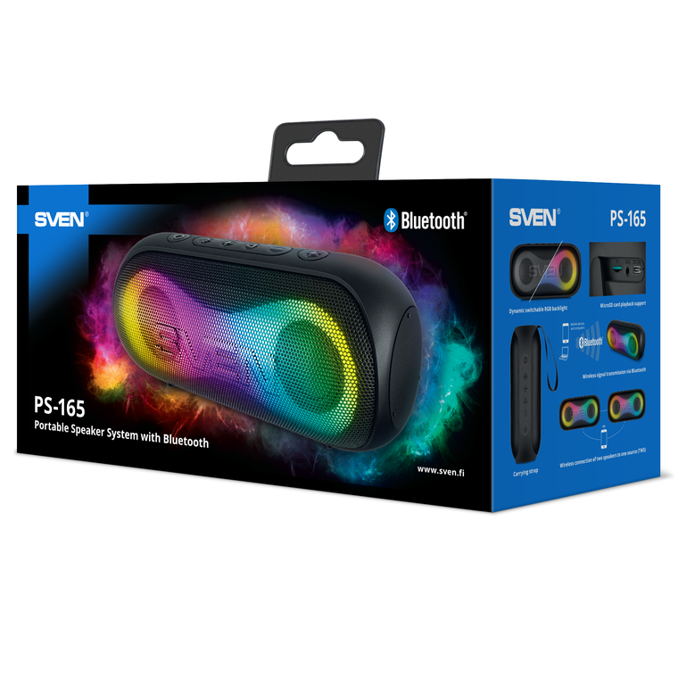 Sven PS-165 это простые и надёжные в использовании портативные колонки от компании Sven. Представленная модель предлагает пользователю небольшие размеры и стильный дизайн, благодаря чему использовать устройство можно в любой обстановке, например, Sven PS-165 можно взять с собой в дорогу.
