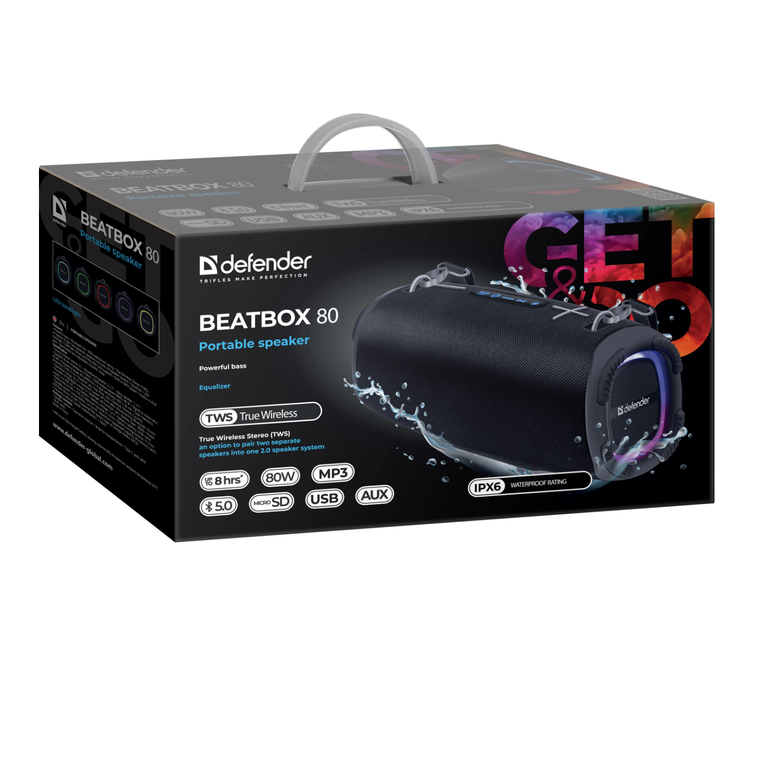 Defender Beatbox 80 это простые и надёжные в использовании портативные колонки от компании Defender. Представленная модель предлагает пользователю небольшие размеры и стильный дизайн, благодаря чему использовать устройство можно в любой обстановке, например, Defender Beatbox 80 можно взять с собой в дорогу.