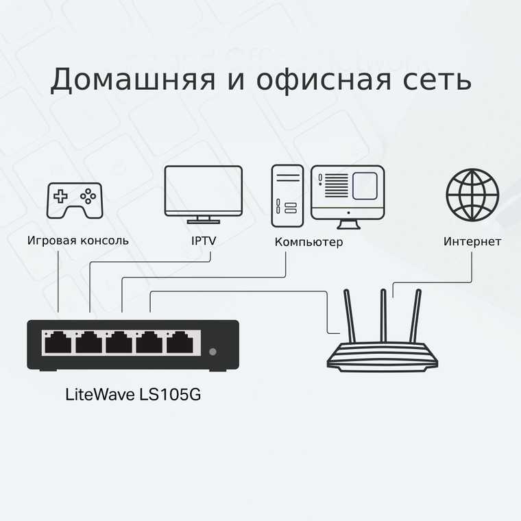 Коммутатор TP-LINK LS105G необходим для того, чтобы Вам не приходилось тянуть сразу несколько проводных соединений. Достаточно будет подключить все необходимые Вам провода к TP-LINK LS105G, а затем подключить его к роутеру.