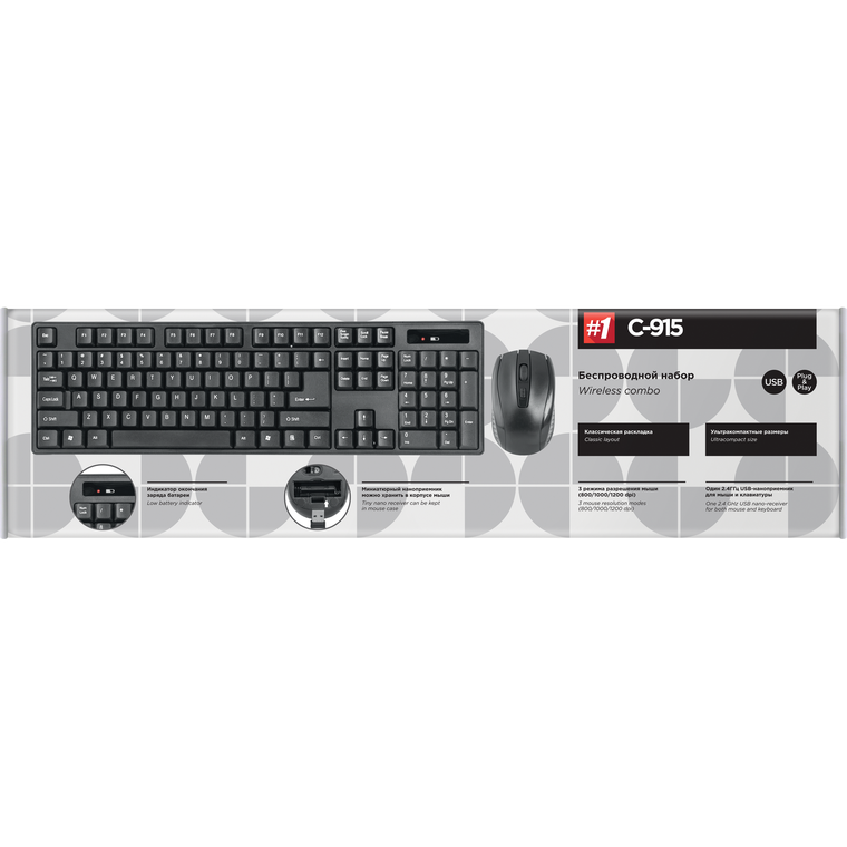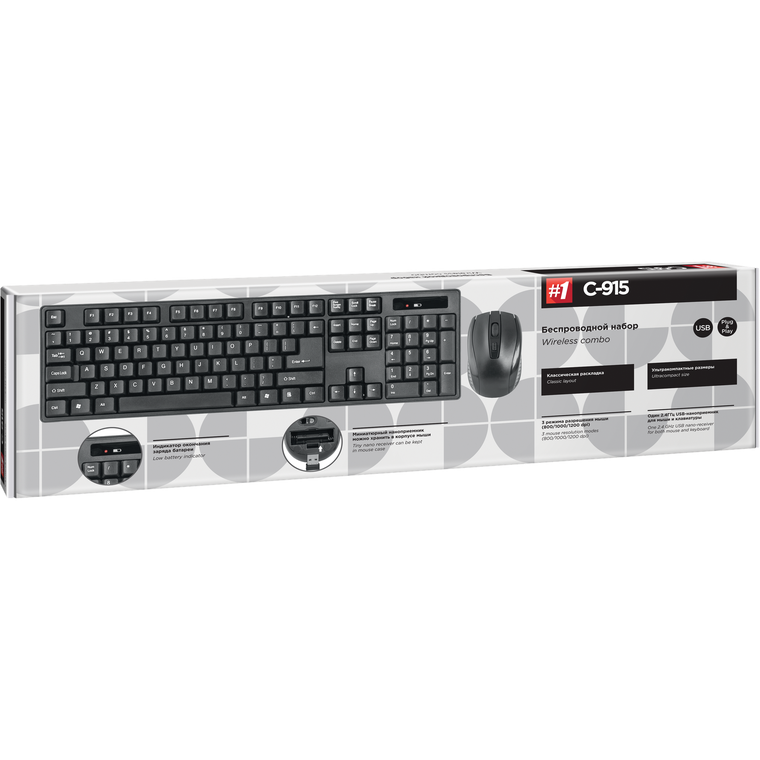 Defender C-915 это комплект, включающий в себя эргономичную клавиатуру и чувствительную мышь. С помощью данного комплекта вы сможете более уверенно управлять работой ПК и оформить рабочий стол в едином стиле. В состав комплекта входит беспроводная