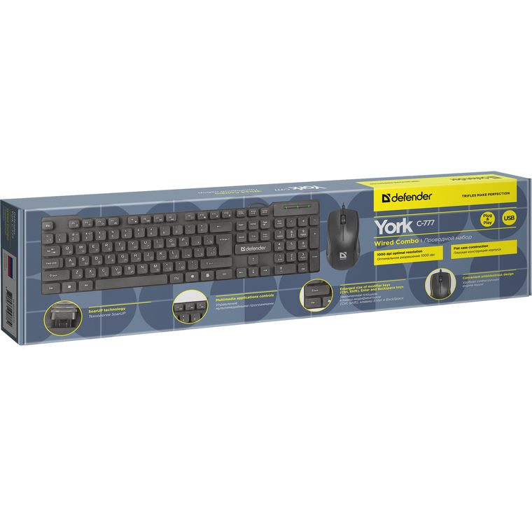Defender York C-777 это комплект, включающий в себя эргономичную клавиатуру и чувствительную мышь. С помощью данного комплекта вы сможете более уверенно управлять работой ПК и оформить рабочий стол в едином стиле. В состав комплекта входит проводная