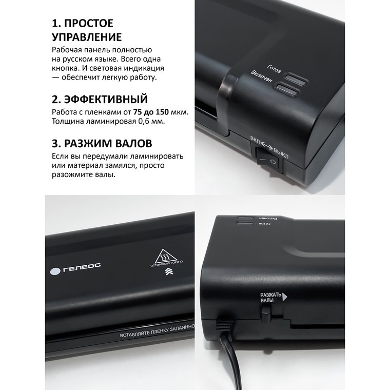 Аппарат изготовлен из современных материалов и полностью соответствует всем стандартам качества. Купить ламинатор ГЕЛЕОС ЛМ-А4К Вы можете всего в пару кликов по доступной цене. Для этого просто достаточно добавить товар в корзину и сделать заказ.