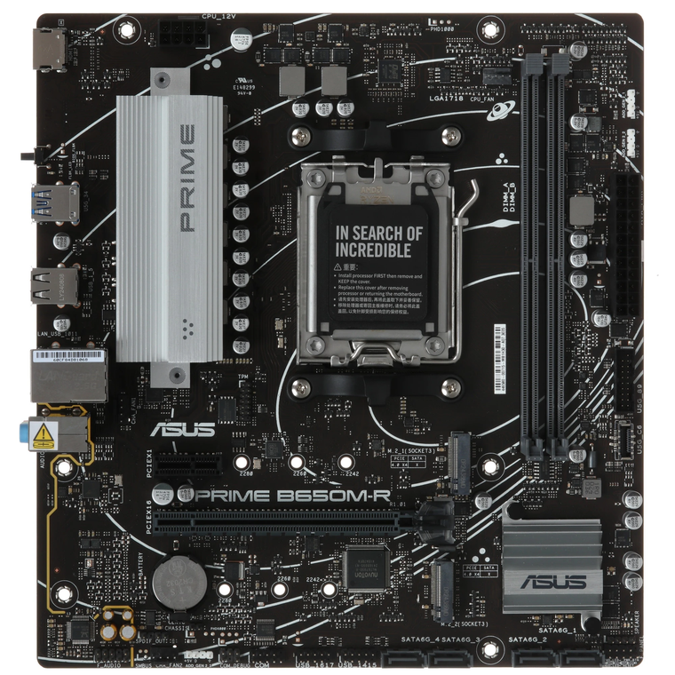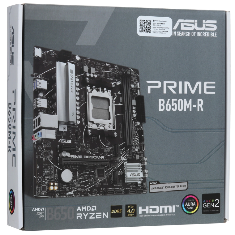 Купить материнскую плату под другие компьютерные комплектующие достаточно просто. Материнская плата Asus PRIME B650M-R оснащена AM5 разъёмом для установки процессоров, а также чипсетом AMD B650. Для установки модулей оперативной памяти в конструкции платы представлено 2 слота, при этом максимальный объём «оперативки» может достигать 96 гигабайт. В конструкции платы представлены все необходимые слоты и разъёмы для установки и подключения компьютерных комплектующих, таких как жёсткий диск, оптический накопитель, различные типы контроллеров.