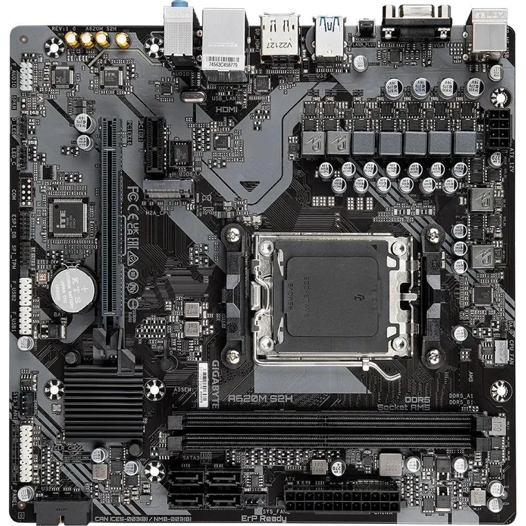 Купить материнскую плату под другие компьютерные комплектующие достаточно просто. Материнская плата GigaByte A620M S2H оснащена AM5 разъёмом для установки процессоров, а также чипсетом AMD A620. Для установки модулей оперативной памяти в конструкции платы представлено 2 слота, при этом максимальный объём «оперативки» может достигать 96 гигабайт. В конструкции платы представлены все необходимые слоты и разъёмы для установки и подключения компьютерных комплектующих, таких как жёсткий диск, оптический накопитель, различные типы контроллеров.