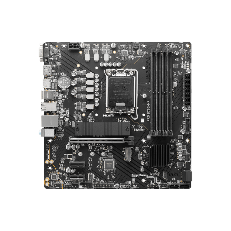 Купить материнскую плату под другие компьютерные комплектующие достаточно просто. Материнская плата MSI PRO B760M-P оснащена LGA1700 разъёмом для установки процессоров, а также чипсетом Intel B760. Для установки модулей оперативной памяти в конструкции платы представлено 4 слота, при этом максимальный объём «оперативки» может достигать 128 гигабайт. В конструкции платы представлены все необходимые слоты и разъёмы для установки и подключения компьютерных комплектующих, таких как жёсткий диск, оптический накопитель, различные типы контроллеров.