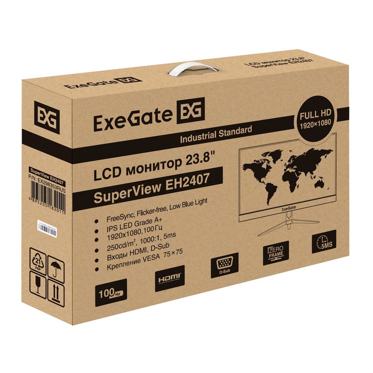 В конструкции игрового монитора использована IPS матрица с частотой обновления 100 Гц, поддерживающая разрешение 1920x1080 пикселей. Представленная модель отличается широкими углами обзора матрицы позволяющими комфортно просматривать видео из любой точки помещения. Быстрый отклик матрицы монитора ExeGate EH2407 SuperView позволит вам играть в самые современные игры и просматривать динамичные сцены. Также стоит отметить и отличные показатели яркости и контрастности матрицы представленной модели.