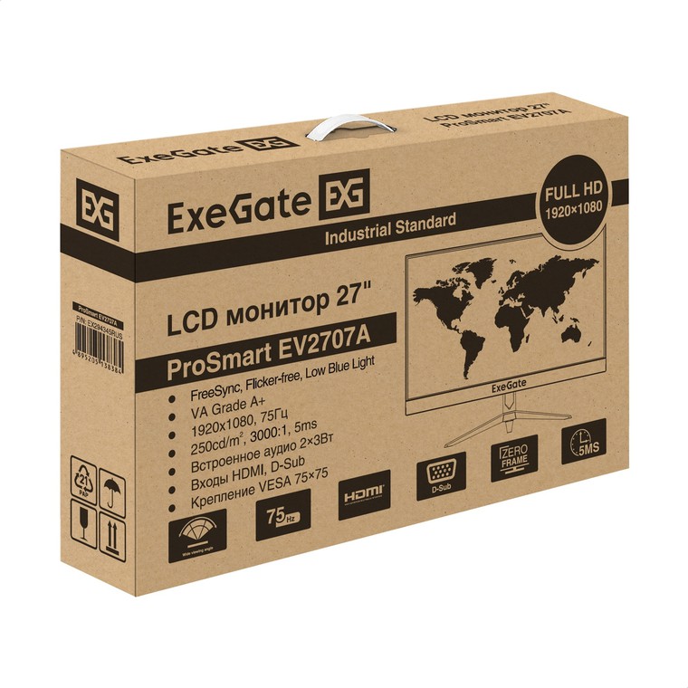 В мониторе для компьютера использована VA матрица, поддерживающая разрешение 1920x1080 пикселей. Представленная модель отличается широкими углами обзора матрицы позволяющими комфортно просматривать видео из любой точки помещения. Быстрый отклик матрицы монитора ExeGate EV2707A позволит вам просматривать динамичные сцены, что добавит реалистичности в фильмах и сериалах. Также стоит отметить и отличные показатели яркости и контрастности матрицы представленной модели.