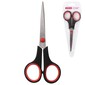 Кромки лезвий отлично заточены, что позволяет с высокой точностью и эффективностью резать различные материалы. Длина лезвия ножниц составляет 15 сантиметров. Руки ножниц изготовлены из качественно пластика, имеют эргономичную форму и крашены в черный/красный цвет.