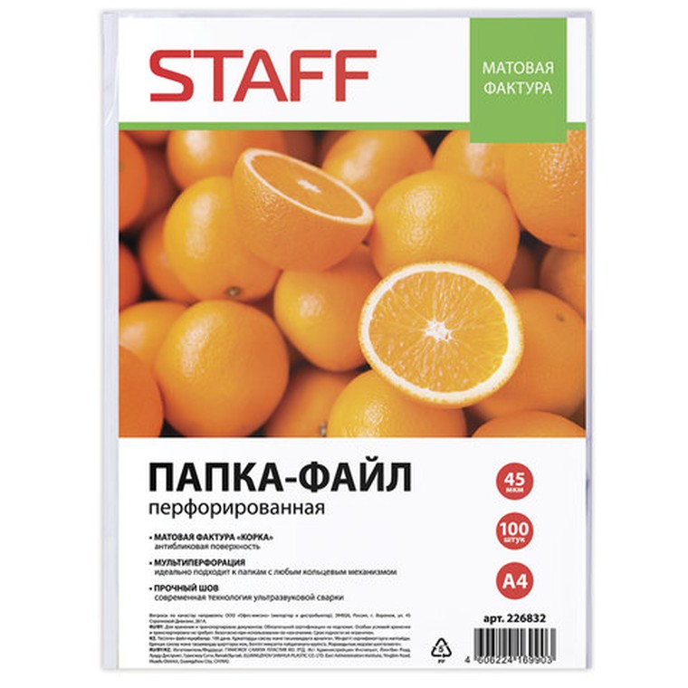 Папка-вкладыш (файл) с перфор. А4 (100шт/пач), апельсин.корка 45мкм STAFF
