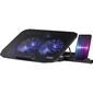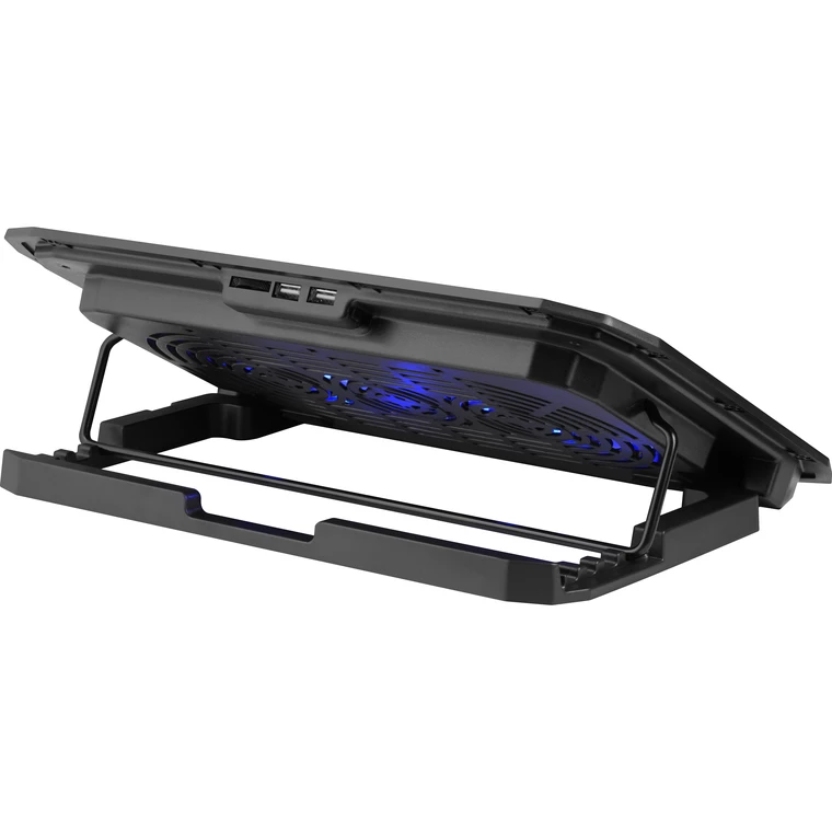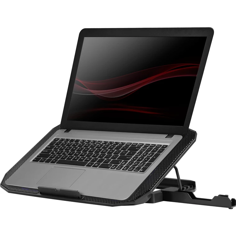 Подставка под ноутбук ориентирована на ноутбуки с максимальным размером экрана в 15 дюймов по диагонали. Подставка имеет классический дизайн, окрашена в черный цвет и хорошо смотрится на рабочем столе, гармонично дополняя дизайн помещения. Во время работы гаджета используется активное охлаждение. Вентиляторы используемые в системе охлаждения обеспечивают равномерное охлаждение всей поверхности ноутбука. Корпус подставки изготовлен из прочных и качественных материалов, что значительно повышает срок её эксплуатации.