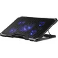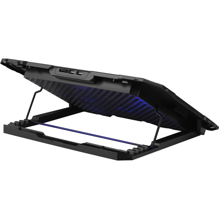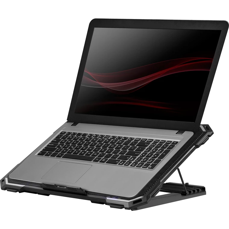 Подставка под ноутбук ориентирована на ноутбуки с максимальным размером экрана в 17 дюймов по диагонали. Подставка имеет классический дизайн, окрашена в черный цвет и хорошо смотрится на рабочем столе, гармонично дополняя дизайн помещения. Во время работы гаджета используется активное охлаждение. Вентиляторы используемые в системе охлаждения обеспечивают равномерное охлаждение всей поверхности ноутбука. Корпус подставки изготовлен из прочных и качественных материалов, что значительно повышает срок её эксплуатации.