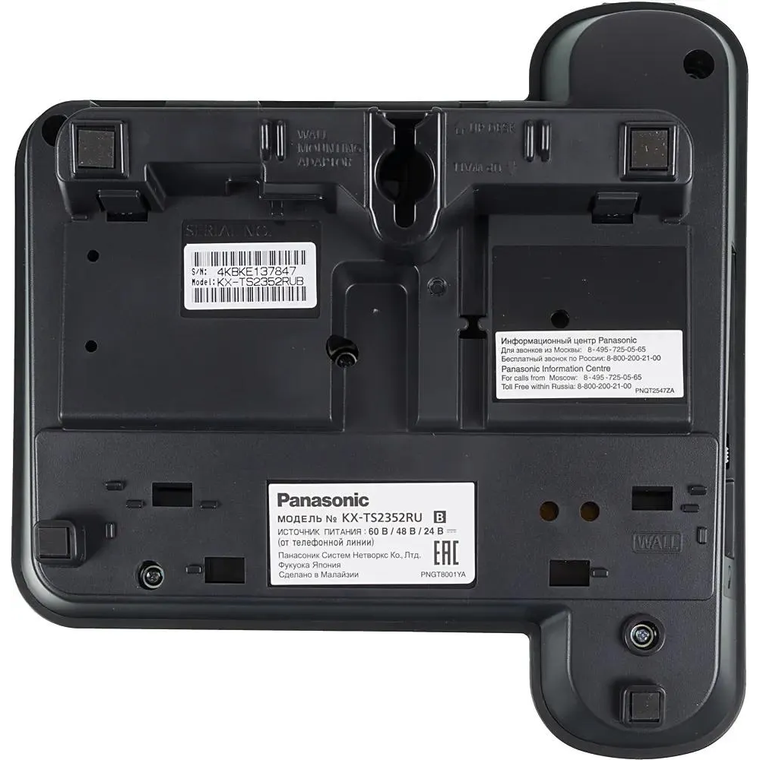 Для размещения в вертикальном положении на обратной стороне корпуса расположены отверстия для крепления винтов. Для набора номера вызываемого абонента на корпусе проводного телефона Panasonic KX-TS2352RUB есть кнопки, изготовленные из прочного пластика.