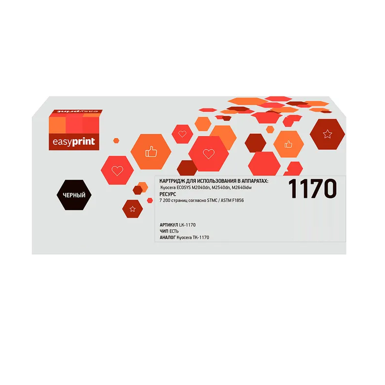 Картридж (TK-1170) совместим с такими моделями принтеров, как Kyocera M2040dn/M2540dn/M2640idw. Средний ресурс картриджа - 7200 стандартных страниц, однако реальный ресурс может изменяться в зависимости от выводимых на печать документов или изображений.