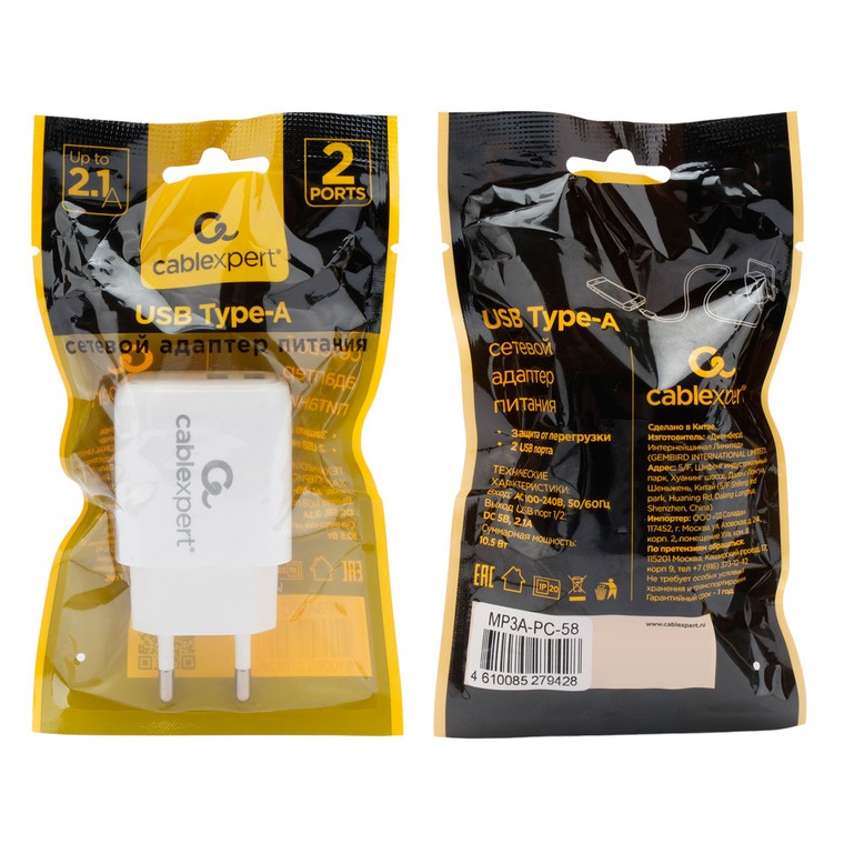 Зарядное устройство Cablexpert MP3A-PC-58 имеет небольшие размеры и благодаря оригинальному дизайну корпуса гармонично сочетается с любым устройством. Простота конструкции, неприхотливость в использовании, отличные технические характеристики. Всё это Cablexpert MP3A-PC-58!